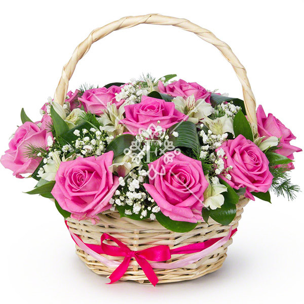 Чудесные розовые розы элегантны и восхитительны, а их чувственный и неповторимый аромат без слов расскажет о Вашем трепетном отношении к прекрасной получательнице. Цветы оформлены в чудесную плетеную корзинку, а их благородство подчеркивает декоративная зелень и белоснежная гипсофила.
